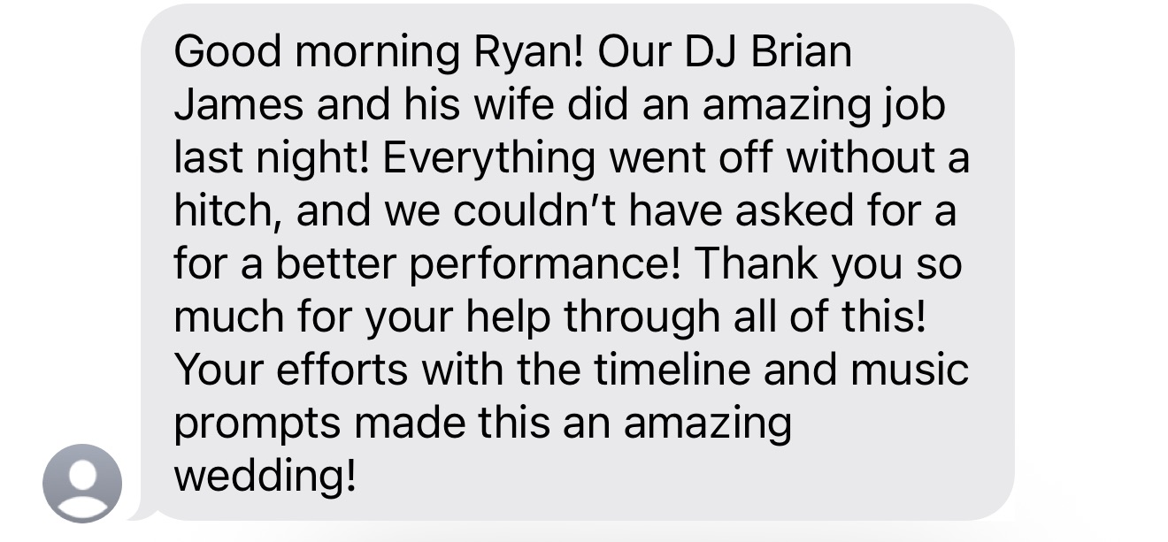 Working with Ryan was consistently a seamless and easy process for us. From the first call, it was clear he is a true pro and we felt like we weren’t just another client for him. Whether you want to control all aspects of the playlist, or have Ryan take the wheel, he’s the guy. His app is also very easy to use and worked flawlessly, he even edited our first dance song to our exact specifications. The dance floor was hot all night long! We strongly would recommend to anyone looking for a professional DJ that makes you feel heard.”